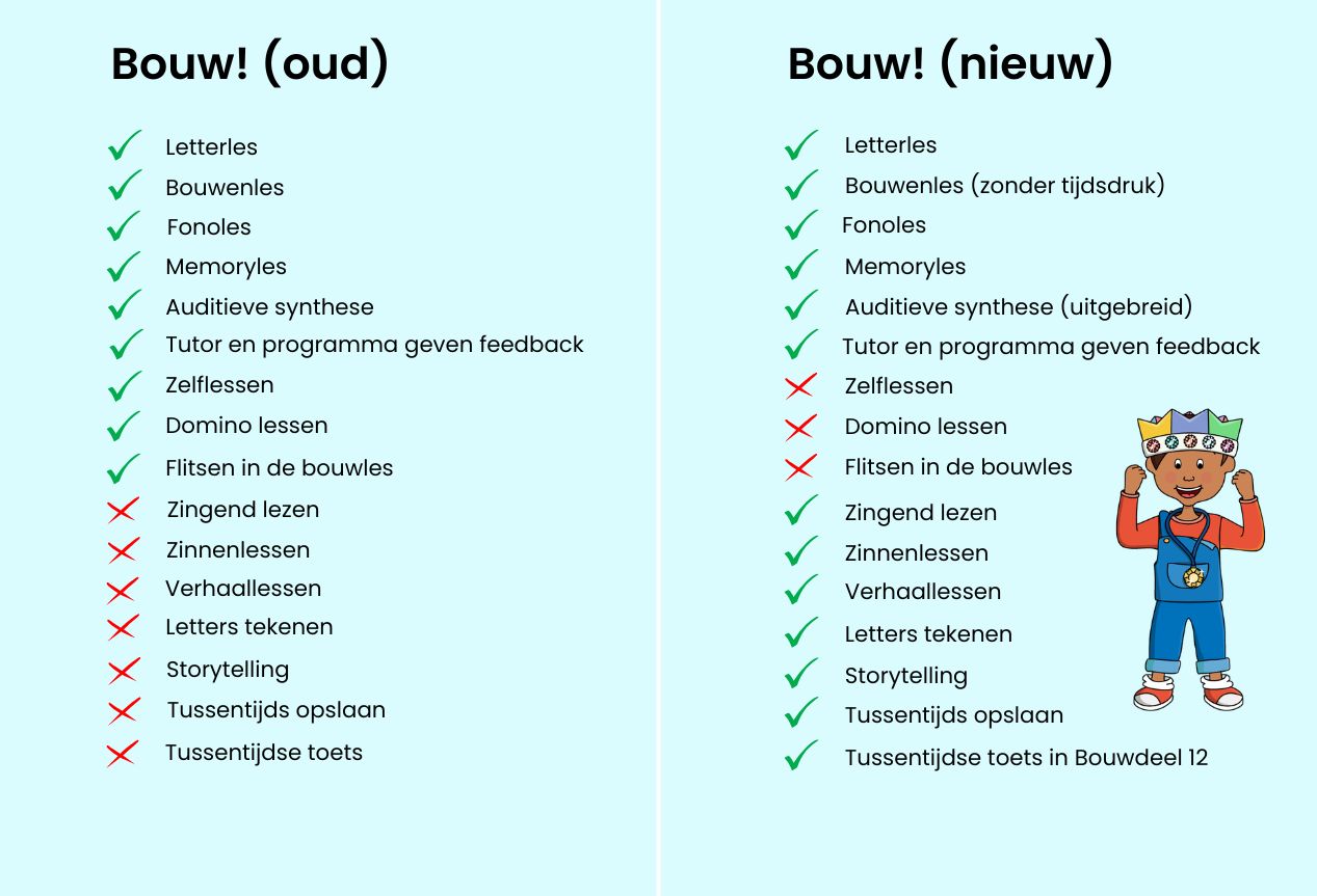 Hoe lang blijft de oude BOUW!-versie beschikbaar?Dit is afhankelijk van de releasedatum, maar op het moment dat we releasen gaat iedere leerling automatisch over. Vanaf dat moment werkt iedereen met het nieuwe, verbeterde programma. Er is dus geen overgangsperiode.